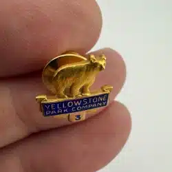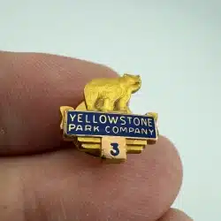 At the top of this rare pin is a bear or bear cub figure, with the text “Yellowstone Park Company” displayed below. Beneath the wording is the number “3,” forming a vertically arranged service award design.