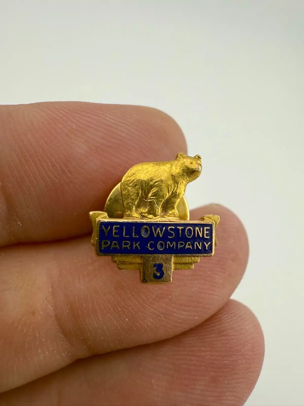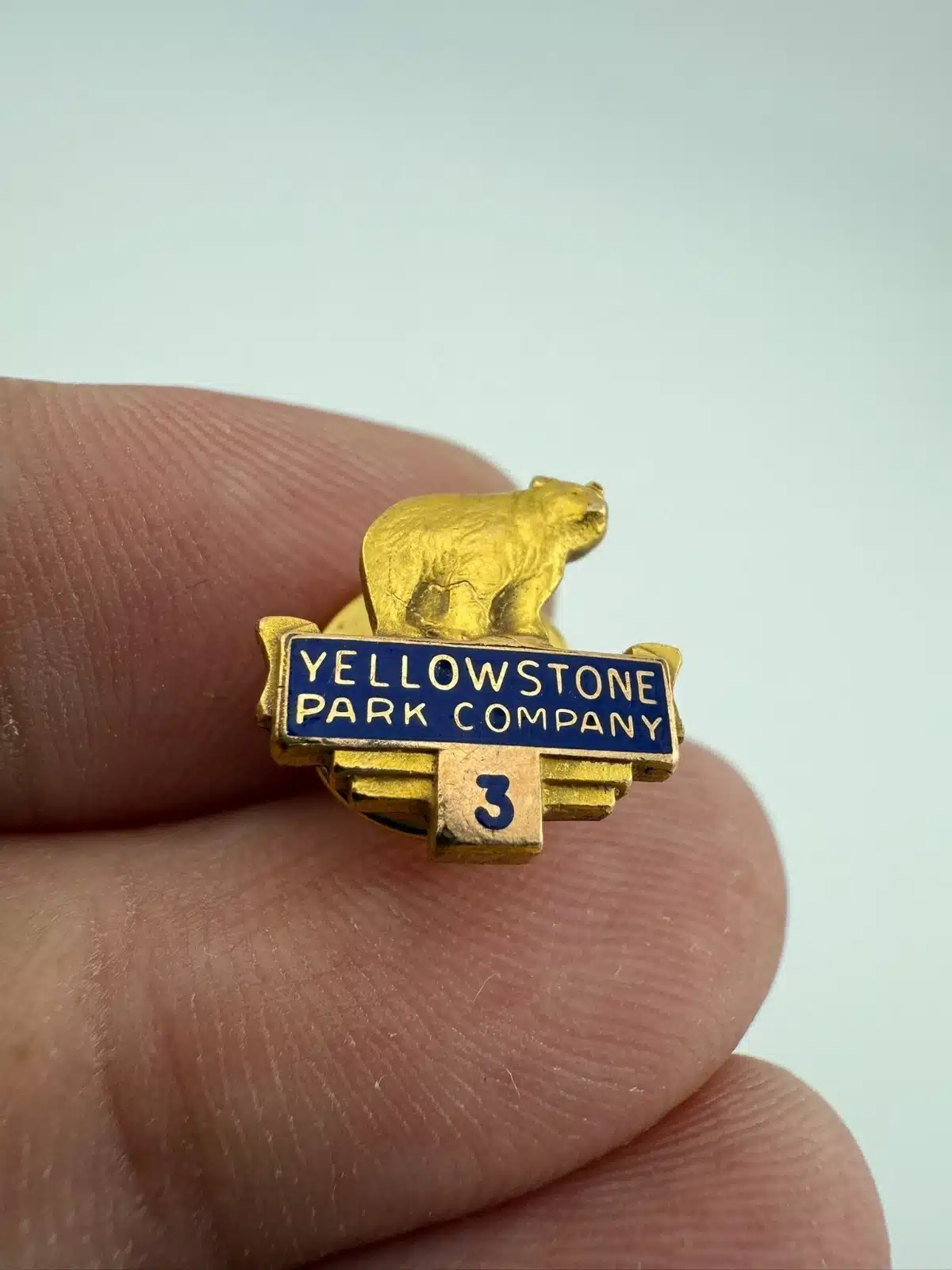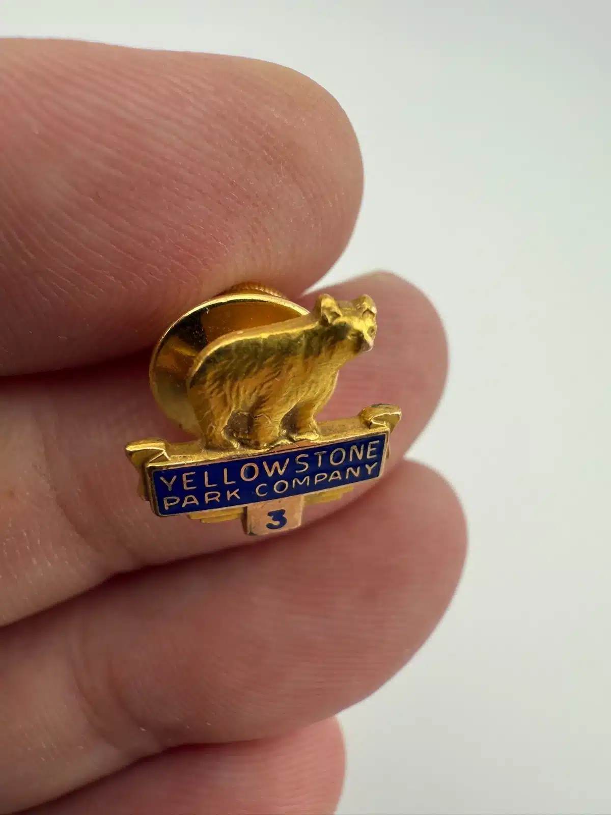 At the top of this rare pin is a bear or bear cub figure, with the text “Yellowstone Park Company” displayed below. Beneath the wording is the number “3,” forming a vertically arranged service award design.